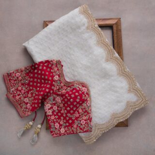 Material : Silk Pattern : All over Saree Color : White & Red Saree Fabric : Silk Saree length : 5.5 Mtrs Saree type: Embroidery Blouse Fabric : Silk Blouse Length : 0.80m