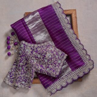 Material : Silk Pattern : All over Saree Color : Violet Saree Fabric : Silk Saree length : 5.5 Mtrs Saree type: Embroidery Blouse Fabric : Silk Blouse Length : 0.80m
